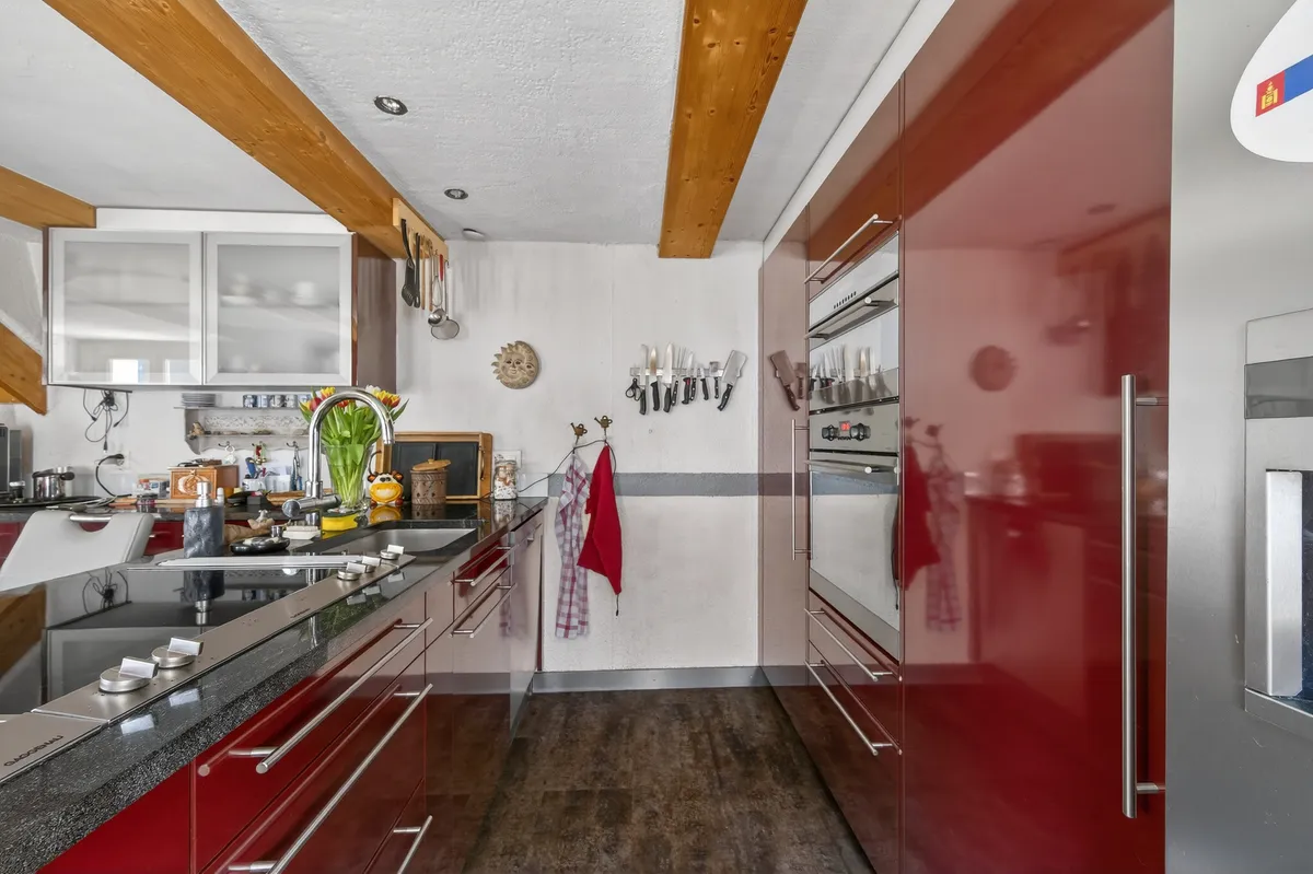- Voll ausgestattete Küche in modernen Rottönen und hochwertigen Geräten