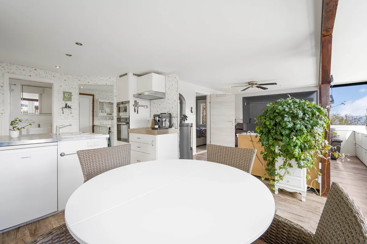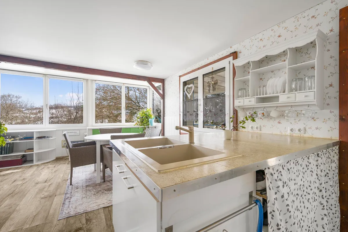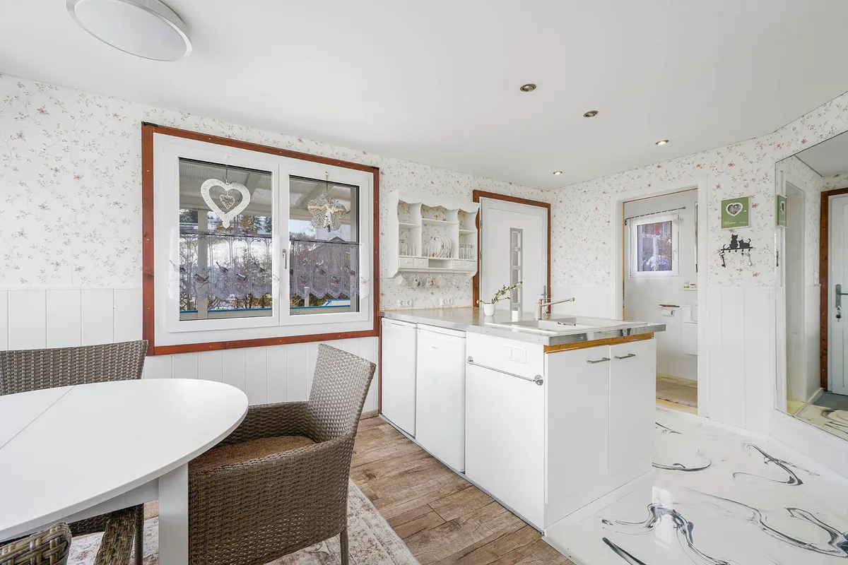 Das Interieur des Hauses besticht durch eine geschmackvolle Kombination aus Laminat- und Epoxidharzböden, die ein gemütliches Wohnambiente schaffen. In der einladenden, offenen Einbauküche können Sie Ihre kulinarischen Fähigkeiten voll entfalten und Ihre Gäste beeindrucken.
